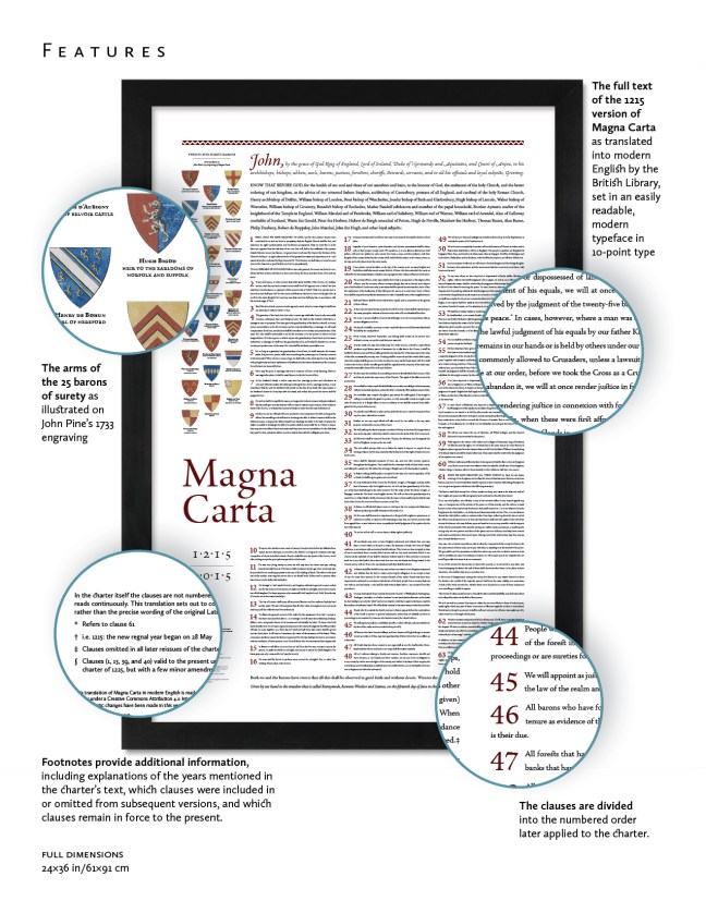 In tribute to Magna Carta’s centuries-long history, the arms of the 25 barons of surety as illustrated on John Pine’s 1733 engraving of Magna Carta are displayed in vibrant color in the upper left of the print.