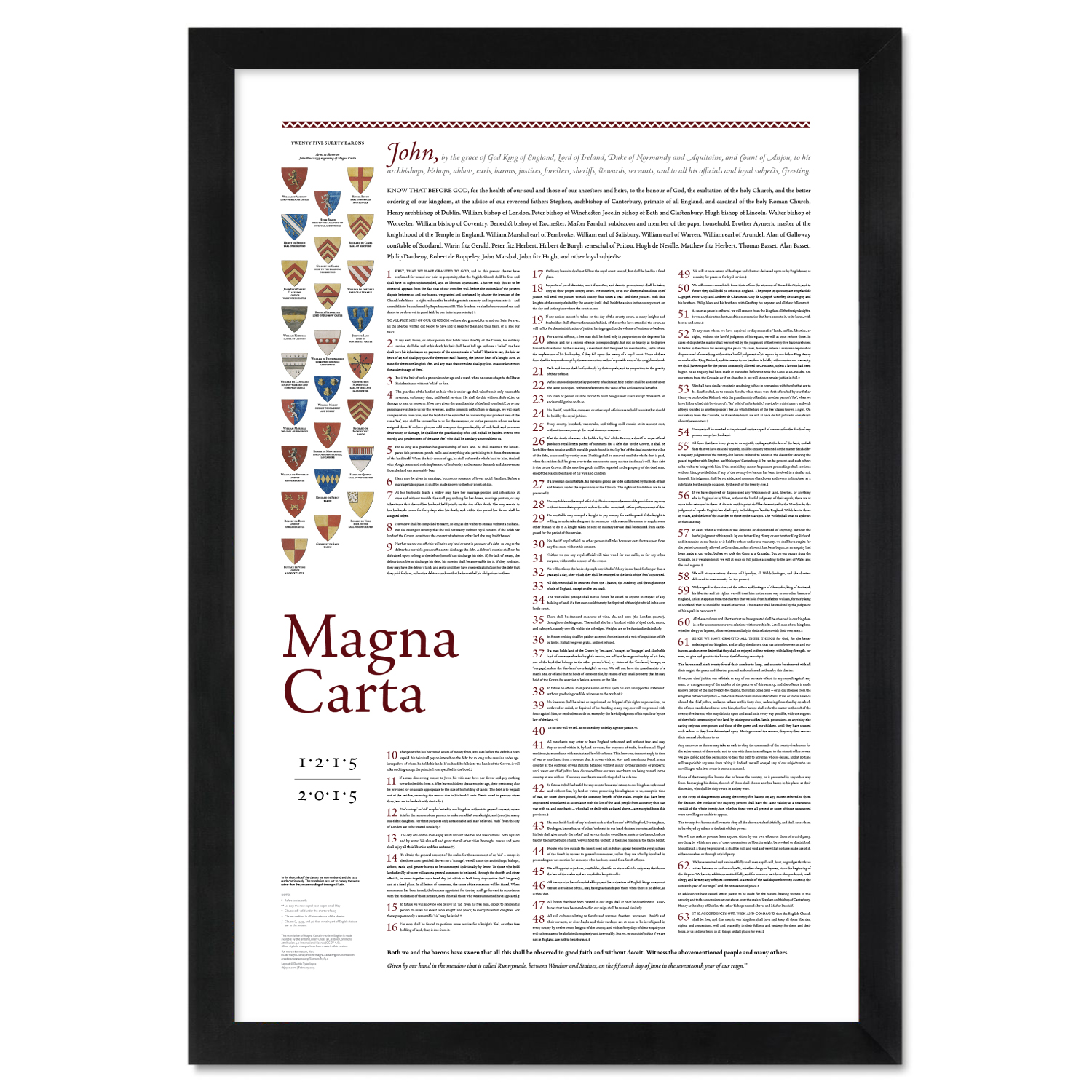 24×36 in (60×90 cm) print of the English translation of Magna Carta in modern, readable type with the arms of the 25 barons of surety as shown on John Pine’s 1733 engraving
